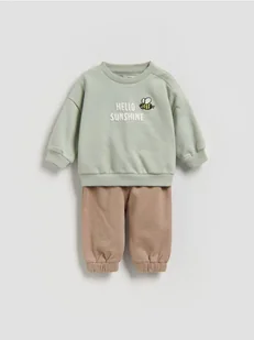 Komplet składający się z bluzy i spodni, wykonany z bawełnianej dzianiny.