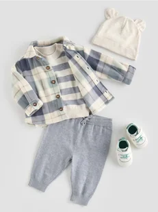Komplet składający się ze swetra, spodni i czapki, wykonany ze strukturalnej, bawełnianej dzianiny.