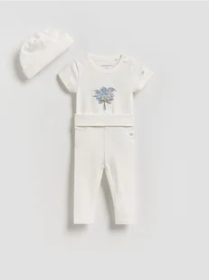 Komplet składający się z body, spodni i czapki, wykonany z bawełny.