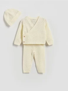 Komplet składający się ze swetra, spodni i czapki, wykonany ze strukturalnej, bawełnianej dzianiny.