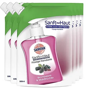 Sagrotan Wkład mydła do rąk (świeży zapach jeżyny i owoców leśnych, antybakteryjne mydło w płynie, w praktycznym opakowaniu), 6 sztuk (6 x 500 ml)