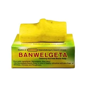 Siddhalepa Ajurwedyjskie mydło Banwelgeta Banwelgeta to w 100% naturalne mydło ajurwedyjskie. Zawiera mieszankę olejków palmowych, aloesu i drewna Columba. Efekt peelingu wywołują włókna palmowe z palm. Nawilżające mydło Banwelgeta z łatwością usuwa z organizmu wszelkie zanieczyszczenia. Nazwa mydła Banwelget pochodzi od rośliny o tej samej nazwie, którą zawiera.