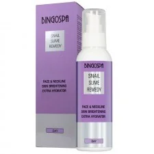 BingoSpa Rozjaśnianie przebarwień skóry twarzy i dekoltu, ekstra nawilżenie - krem na dzień krem ze śluzem ślimaka, 135 ml Rozjaśnianie przebarwień skóry twarzy i dekoltu, ekstra nawilżenie przez cały dzień ! Krem na dzień ze śluzem ślimaka bogatym w wiele substancji o udowodnionym działaniu pielęgnacyjnym. Najważniejsze z nich to: kolagen i elastyna - podstawowe białka skóry właściwej, gwarantujące jej elastyczność i jędrność; mukopolisacharydy działające nawilżająco, chronią skórę przed niekorzystnym wpływem czynników zewnętrznych; kwas glikolowy - zmniejsza widoczność przebarwień; proteiny zbliżone do występujących w skórze człowieka - skóra staje się lepiej odżywiona, gładsza i rozświetlona; witaminy A, C i E działając przeciwrodnikowo, zapobiegają starzeniu się skóry.