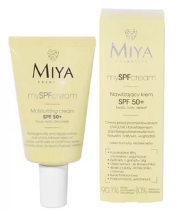 Krem do twarzy Miya my SPFcream:- Fotostabilne filtry (mineralny i organiczne): skutecznie chronią przed przedwczesnym fotostarzeniem się skóry, zapobiegają przebarwieniom i plamom pigmentacyjnym.