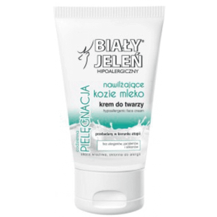 Hipoalergiczny krem do twarzy BIAŁY JELEŃ z kozim mlekiem 100mlKrem do twarzy BIAŁY JELEŃ hipoalergiczny - kozie mleko przeznaczony jest do codziennej pielęgnacji suchej i odwodnionej skóry. Specjalnie opracowana formuła długotrwale nawilża i wygładza skórę. Pozostawia warstwę, która chroni przed przesuszeniem i odwodnieniem skóry w wyniku działania niekorzystnych czynników zewnętrznych. Skutecznie przyspiesza proces łagodzenia podrażnień i wspomaga regenerację naskórka. Krem szybko się wchłania, nie pozostawiając tłustej warstwy, stanowi doskonałą bazę pod makijaż.