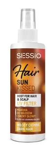 SESSIO HAIR SUN KISSED Spray ochronny UV dla brunetek 200ml SESSIO - HAIR SUN KISSED czyli WŁOSY POCAŁOWANE SŁOŃCEM Naturalną ochroną przed promieniowaniem UV jest pigment czyli melanina. Blond włosy mają więcej feomelaniny, która jest mniej odporna na promieniowanie UV. Włosy ciemne, dzięki eumelaninie lepiej znoszą promieniowanie, ale szybciej blaknie ich kolor. Najgorzej znoszą słońce włosy siwe, rozjaśniane i farbowane tutaj wymagana jest ochrona UV. CO OPRÓCZ OCHRONY UV? Ochrona przed przesuszeniem Zapobieganie blaknięcia koloru Ochrona skóry głowy przed poparzeniami Lekka formuła nie tłuści i nie obciąża włosów DO CIEMNYCH WŁOSÓW WIĘCEJ EKSTRAKTÓW CHRONIĄCYCH KOLOR Pojemność :