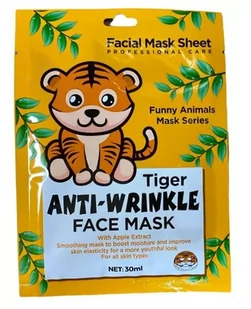 Maseczka przeciwzmarszczkowa w płachcie Funny Animal Mask TYGRYS Innowacyjny wygląd masek Funny Animal Mask zachęca do zabawy podczas codziennej rutyny pielęgnacyjnej. Maska zawiera ekstrakt z jabłka, który spowalnia proces starzenia. Oczar wirginijski, który niweluje zmarszczki, natomiast ekstrakt z truskawki dba o gładkość skóry oraz łagodzi podrażnienia. Działanie: