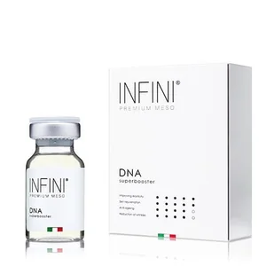 INFINI Premium Meso - DNA SuperBooster (1x10ml) INFINI Premium Meso - DNA SuperBooster to zaawansowany stymulator tkankowy, który łączy kwas hialuronowy, nukleotydy DNA i RNA oraz glutation w celu głębokiej regeneracji i biorewitalizacji skóry. Produkt wykazuje intensywne działanie odmładzające i przeciwstarzeniowe, przywracając skórze jędrność, blask i zdrowy wygląd. Działanie: Regeneracja i odbudowa skóry – nukleotydy w połączeniu z kwasem hialuronowym stymulują fibroblasty do syntezy kolagenu i elastyny. Głębokie nawilżenie i poprawa struktury skóry – kwas hialuronowy zwiększa retencję wody w tkankach, nadając skórze sprężystość. Ochrona antyoksydacyjna – glutation chroni komórki przed stresem oksydacyjnym i wspomaga detoksykację skóry.