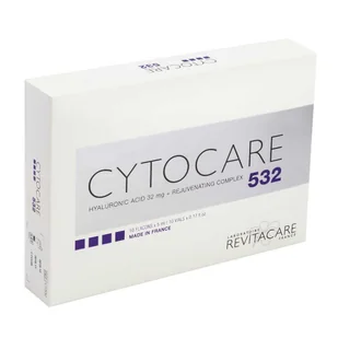 RevitaCare CytoCare 532 5 ml – zaawansowana biorewitalizacja i wygładzenie RevitaCare CytoCare 532 to preparat do mezoterapii od RevitaCare®, łączący wysokie stężenie kwasu hialuronowego (32 mg/5 ml) z 55 aktywnymi składnikami. Zapewnia skórze głębokie nawodnienie, wygładzenie i odżywienie, działa ochronnie i antyoksydacyjnie, a także wspiera regenerację komórkową. Sprawdza się w pielęgnacji skóry z widocznymi oznakami starzenia oraz w profilaktyce pierwszych zmarszczek. Działanie Wygładzenie linii i bruzd oraz poprawa tekstury skóry. Zwiększenie elastyczności i ujędrnienie tkanek.