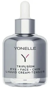 Płynny krem Yonelle Trifusion Liquid Cream Tensor dedykowany jest cerze dojrzałej, wrażliwej i alergicznej. Ten kosmetyczny "mikrochirurg" polecany jest w szczególności do cery wiotkiej i wymagającej ujędrnienia. Dzięki płynnej konsystencji produkt wtapia się w skórę i stanowi doskonały lifting. Produkt redukuje widoczność zmarszczek, zmniejsza pory, wyrównuje oraz poprawia koloryt skóry.