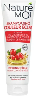 Nature Moi, Szampon do włosów farbowanych z olejkiem z winogron, 250ml Nature Moi Szampon delikatnie oczyszcza włosy po farbowaniu oraz innych zabiegach fryzjerskich, nie uszkadzając ich. Chroni kolor, aby jak najdłużej był tak samo piękny i intensywny, a włosy lśniące jak zaraz po farbowaniu. Bardzo często jest tak, że farbowane włosy wyglądają pięknie tylko do pierwszego mycia, potem kolor simywa, a blask gaśnie. Nature Moi pomaga zachować go na dłużej bez zbędnego obciążania włosów szkodliwymi substancjami chemicznymi. Szampon wspomaga piękny wygląd włosów, zamyka łuski, aby jego struktura była jednolita, dzi temu włosy pięknie lśnią.