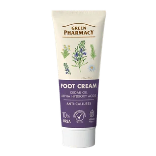 Green Pharmacy Krem do Stóp ze Skłonnością do Zgrubień 75mlKrem do stóp przeznaczony do pielęgnacji suchej, szorstkiej i zrogowaciałej skóry. Pomaga zmniejszyć skłonność do powstawania modzeli i przywraca stopom komfort. Formuła kremu łączy oleje eteryczne z cedru, sosny, jodły syberyjskiej, orzecha włoskiego i rozmarynu, które są źródłem witaminy E i mają działanie zmiękczające. Mocznik, kwas salicylowy i ekstrakt z aloesu wspierają nawilżenie, delikatne złuszczanie i redukcję zrogowaceń. Regularne stosowanie sprawia, że stopy stają się gładkie, miękkie, pachnące i odświeżone.