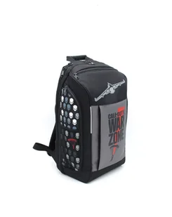 Szaro-czarny plecak jest w całości zaprojektowany w motywie Call of Duty: Warzone. Z przodu znajduje się duże logo gry, samolot przelatujący nad strefą zrzutu, a boki są wykończone symbolami czaszek. Wewnętrzna wyściółka jest utrzymana w niebiesko-szarym kamuflażu.