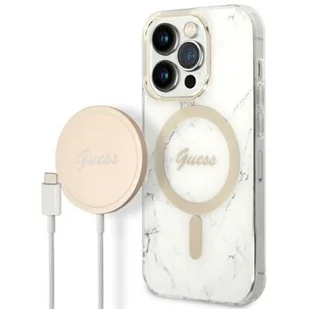 Guess Zestaw GUBPP14XHMEACSH Case+ Charger iPhone 14 Pro Max 6,7" biały/white hard case Marble MagSafe