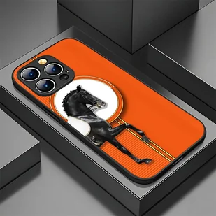 TEMU Etui na telefon: Luksusowe pomarańczowe okrągłe patchworkowe etui z szlachetnym czarnym koniem, ochrona obiektywu, kompatybilne z iPhone 16 Pro
