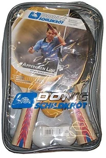 Zestaw do tenisa stołowego produkcji renomowanej niemieckiej firmy Donic-Schildkröt. Zestaw APPELGREN 300 4-PLAYER SET - 4 rakietki Appelgren 300, 3 piłeczki (2 białe i 1 pomarańczowa) i siatka CLASSIC. Rakietki z lini Appelgren 300 posiadają okładziny klasy 300 /gumy Jade z gąbką 1,5 mm klasy Control/. Okładziny posiadają autoryzację ITTF /Autorized Racket Covering/. Deska w tej rakietce to 5 warstwowa sklejka typu Basic.