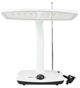 Lampka biurkowa LED Regulowana płynnie barwa światła Wbudowane solidne Radio FM z Głośnikiem Zasilana z sieci lub wewnętrznego akumulatora Regulowane obrotowe ramie od 20-39 cm wysokości Panel świetlny o wymiarach 26x9cm - 40 LED Panel LED ustawiamy pod dowolnym kątem. Możemy oświetlić biurko ,ścianę ,sufit itp. Podstawa z radiem 17x12 cm Chowana antena z boku podstawy Lampa jest bardzo solidnie i estetycznie wykonana. Dane techniczne: Duża pojemność akumulatora - 1600 mAh Ilość wysokowydajnych diod SMD - 40 szt.