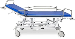 Prowadzenie i manewrowanie wózkiem ułatwiają uchwyty ze stali nierdzewnej na szczytach wózka oraz w standardzie system dużych kół kierunkowych o średnicy 125 mm z możliwością zablokowania kierunku jazdy 2 kół (blokada skrętu) oraz możliwością blokady jazdy 2 kół (hamulec postojowy). W opcjach wyposażenia dodatkowego wózek może być wyposażony w system kół 125 mm lub 200 mm z centralną blokadą. Wózek posiada też miękkie odboje zamontowane w narożnikach wózka. Charakterystyka i zalety wózka do transportu pacjentów JWZ 02 hydrauliczna regulacja wysokości leża przyciskami nożnymi w zakresie 51-95 cm 2 częściowe leże o wymiarach 194 x 63 cm z płyty HPL przeziernej dla promieni RTG długa sekcja zagłówka - 63 cm pneumatyczna regulacja kąta nachylenia zagłówka w zakresie -25 do +60 pneumatyczna regulacja kąta nachylenia leża w zakresie -10 do 0 do pozycji Trendelenburga wymienny materac z uchwytami do przenoszenia pacjenta na materacu atestowana tapicerka materaca w wielu kolorach do wyboru wypełnienie materaca elastyczną pianką poliuretanową składane poniżej leża barierki boczne ze stali nierdzewnej uchwyty szczytowe ze stali nierdzewnej do prowadzenia wózka maksymalne obciążenie do 250 kg solidna i stabilna rama stalowa lakierowana proszkowo krążki odbojowe w narożach wózka system kół kierunkowych z blokadami jazdy i skrętu (centralna blokada kół w opcji dodatkowej) dostępne dodatkowe wyposażenie (m. in. kosz na butlę z tlenem, wysięgnik kroplówki) certyfikowany wyrób medyczny darmowa dostawa pod adres budynku na terenie Polski (przesyłka paletowa) - zobacz: warunki realizacji darmowej dostawy darmowa usługa Raben ADV (telefoniczne awizo o planowanej godzinie dostawy) - zobacz: