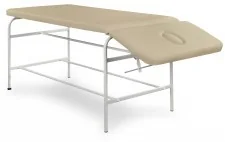 Norma II B wysoka i szeroka kozetka lekarska 3-częściowa z regulowanymi sekcjami zagłówka i podnóżka Wysoka i szeroka kozetka lekarska o stałej wysokości wykonana na stabilnej konstrukcji z lakierowanych proszkowo profili stalowych. Kozetka posiada 3-częściowe leże wypełnione elastyczną pianka PU z regulowanym w zakresie +/- zagłówkiem wyposażonym w otwór do oddychania z zatyczką oraz z podnoszonym podnóżkiem. Leże pokryte jest bezszwową tapicerką z atestowanego i zmywalnego materiału skóropodobnego (paleta Standard Line) lub winylowego (paleta Exclusive Line). Standardowo kozetka wyposażona jest w podgumowane stopki z jedną stopką regulacyjną do poziomowania kozetki na nierównej powierzchni. W opcjach wyposażenia dodatkowego kozetkę za dopłatą można doposażyć w 4 kółka kierunkowe z hamulcem (blokadą jazdy) zamiast stopek oraz w uchwyt na podkłady higieniczne w rolce o szerokości 70 cm, a także w praktyczną półkę pod leżem na akcesoria i w odboje na nogach kozetki.