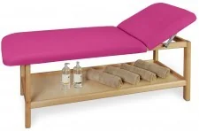 Hera 75 drewniana leżanka medyczna 2-częściowa wysoka z regulowanym zagłówkiem Wysoka leżanka medyczna o stałej wysokości wykonana na stabilnej konstrukcji z wyselekcjonowanego drewna bukowego w trzech kolorach wybarwienia do wyboru. Posiada 2-częsciowe leże wypełnione elastyczną pianką PU o grubości 10 cm z regulowaną sekcją zagłówka. Leże pokryte jest bezszwową tapicerką z atestowanego i zmywalnego materiału skóropodobnego (paleta Standard Line) lub winylowego (paleta Exclusive Line). Leżanka wyposażona jest w funkcjonalną półkę na akcesoria do fizykoterapii lub masażu albo zabiegów kosmetycznych. W opcjach dodatkowych leżanka można być wykonana z otworem do oddychania w sekcji zagłówka (z zatyczką lub bez) oraz doposażona w uchwyt na podkłady higieniczne w rolkach o szerokości 60 cm i w podgłówek (prosty lub regulowany) montowany do krawędzi leża w przygotowanych do tego celu gniazdach.