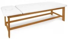 Relax II 65 drewniana leżanka medyczna 3-częściowa z regulowanym zagłówkiem i regulowanym podnóżkiem Leżanka medyczna o stałej wysokości wykonana na stabilnej konstrukcji z wyselekcjonowanego drewna bukowego w trzech kolorach wybarwienia do wyboru. Posiada 3-częściowe leże z regulowaną sekcją zagłówka i regulowaną sekcją podnóżka. Zagłówek wyposażony jest w otwór do oddychania z zatyczką. Leże pokryte jest bezszwową tapicerką z atestowanego i zmywalnego materiału skóropodobnego (paleta Standard Line) lub winylowego (paleta Exclusive Line). W opcjach wyposażenia dodatkowego, za dopłatą leżanka medyczna może zostać wyposażona w wieszak na podkłady higieniczne w rolkach (szerokość rolki 60 cm), a także w 4 kółka kierunkowe zaopatrzone w hamulec postojowy (blokadę jazdy).