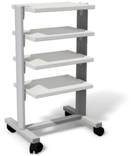 Stolik-wózek Juventas STA-05 z 4 półkami pod aparaty medyczne Stolik Juventas STA-05 z funkcją wózka pod aparaturę medyczną i aparaty do fizykoterapii wyposażony w cztery wytłaczane półki do ustawienia aparatów medycznych. Wszystkie elementy stolika-wózka oparte są na stelażu aluminiowym umożliwiającym pionową regulację położenia półek, co umożliwia zastosowanie stolika pod aparaty medyczne o większej wysokości. Półki posiadają podniesione ranty boczne zabezpieczające aparat przed zsunięciem. Półki wykonane są ze stali. Stolik posiada stalową podstawę wyposażoną w kółka kierunkowe z blokadą (hamulcem) Stolik w całości lakierowany jest proszkowo na kolor biały.