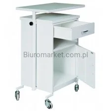 Przyłóżkowa szafka medyczna z regulowanym blatem i szufladą jest meblem pojemnym i skonstruowanym z najwyższą precyzją i starannością. Pokryta jest białą melaminową powłoką, która zapewnia jej niezbędną odporność na uszkodzenia mechaniczne, zarysowania czy korozję. Szafka jest modelem symetrycznym, a więc szuflada i szafka otwierają się z obydwu stron, co umożliwia stawianie jej po obu stronach łóżka. Obecność kółek pozwala na wygodne przetransportowanie szafki, a jednocześnie dzięki blokadzie, w które wyposażone są dwa z kółek, niemożliwe staje się jej przypadkowe przemieszczanie. Blat szafki posiada regulowaną wysokość, a także możliwość jego wy-sunięcia i położenia, dzięki czemu korzystanie z niego jest jeszcze bardziej wygodne.