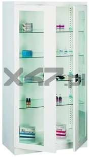 Metalowa szafa medyczna, dwuskrzydłowa z drzwiami szklanymi.
