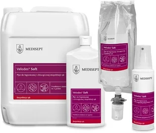 Dostępność kilku pojemności pozwala dopasować rozmiar do potrzeb i czyszczonej powierzchni. Większe 5-cio litrowe karnisterki idealnie sprawdzą się w miejscach o dużej częstotliwości odwiedzin , gdzie liczba korzystających ze sprzętu osób, a w związku z tym zużycie, znacznie przekracza wartość przeciętną. W takim przypadku warto zainwestować w sprawdzone produkty, spełniające wszelkie normy bezpieczeństwa i gwarantujące wysoką skuteczność. Velodes Soft to gotowy do użycia alkoholowy preparat, przeznaczony do higienicznej i chirurgicznej dezynfekcji rąk. Posiada potwierdzone badaniami spektrum bakteriobójcze, bójcze wobec prątków gruźlicy, drożdżakobójcze i ograniczone wirusobójcze.