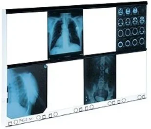 Negatoskop wysokiej częstotliwości Ultra-Viol NGP-80 HF z 2 ekranami 4-klatkowymi 2x 144x43 cm na statywie przejezdnym Negatoskop wysokiej częstotliwości Ultra-Viol NGP-80 HF z serii negatoskopów świetlówkowych posiada dwa rzędowe ekrany 4-klatkowe o szerokości 144 cm i wysokości 43 cm każdy (łącznie 8 klatek) pozwalające na wygodne i precyzyjne przeglądanie klisz rentgenowskich w każdej klatce niezależnie. Źródłem luminacji w tym negatoskopie są świetlówki TLD z zapłonnikami emitujące bardzo łagodne światło o temperaturze barwowej 6500K (światło dzienne), a przy tym perfekcyjnie oddające wszelkie kontrasty. Negatoskop zapewnia wysoką równomierność emisji światła na całej powierzchni każdej klatki bez efektu drżenia światła i bez efektu stroboskopowego. Ekrany negatoskopu wykonano z wysokogatunkowego metalplexu altuglas i osadzono w estetycznej i trwałej obudowie z blachy stalowej lakierowanej proszkowo. Do zawieszania klisz RTG służą trwałe uchwyty rolkowe.