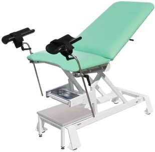 Wypełnienie leża stanowi elastyczna pianka PU wysokiej jakości. Fotel ginekologiczny pokryty jest bezszwową tapicerką z atestowanego materiału skóropodobnego w kolorze do wyboru z palety standard lub palety Prestige. W fotelu ginekologicznym zamontowane są regulowane we wszystkich płaszczyznach podkolanniki oraz pojemnik ze stali nierdzewnej. Dołączony do fotela składany podest ułatwia pacjentom wejście i zejście z fotela ginekologicznego. Podstawa fotela ginekologicznego posiada w standardzie podgumowane stopki antypoślizgowe z możliwością stabilizacji i poziomowania fotela, które w opcji dodatkowej można zamienić na system opuszczanych kół jezdnych z hamulcem.