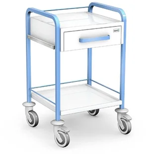 Stolik zabiegowy STKO-01/B ST z blatem zabiegowym i szufladą Stolik-wózek zabiegowy wykonany ze stali lakierowanej proszkowo. Wyposażony w blat zabiegowy z pogłębieniem, szufladę na drobny sprzęt zabiegowy lub akcesoria oraz w 2 boczne odcinki szyny instrumentalnej do mocowania lub zawieszania innego wyposażenia zabiegowego oraz w praktyczną dolną półkę z trzech stron zabezpieczoną relingiem. Stolik zabiegowy posiada stelaż z giętego profilu stalowego z uchwytami do przetaczania stolika w obrębie gabinetu lub placówki. Posadowiony jest na mobilnej podstawie wyposażonej w duże, skrętne koła kierunkowe o średnicy 10 cm z wysuniętymi odbojami. Dwa przednie koła wyposażone są w blokadę jazdy (hamulec postojowy).