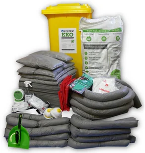 Doskonała chłonność - 3 kg sorbentu wchłania 30 l cieczyNaturalny sorbent bezpieczny dla ludzi i zwierzątSkład zestawu: pojemnik na kółkach 240 l. 1 szt. maty uniwersalne, szare 40 x 50 cm150 szt. rękawy uniwersalne, szare 8 cm x 1,2 m8szt. rękawy uniwersalne, szare 8 cm x 2,4 m4 szt.