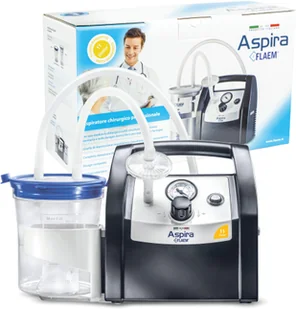 Flaem Aspira to poręczny, kompaktowy ssak. Jest zalecany zarówno do użytku szpitalnego jak i domowego. Może być wykorzystany do odsysania wszelkiego rodzaju wydzielin: krwi, śluzu itp.. Dzięki specjalnej konstrukcji filtra i nowoczesnej zaawansowanej technologii silnika pracuje równo i cicho.