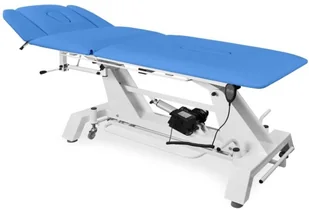 Stół rehabilitacyjny Juventas KSR-F 3-częściowy z ręczną regulacją wysokości i funkcją fotela Stół rehabilitacyjny Juventas KSR-F do rehabilitacji lub masażu wyposażony w ręczną regulację wysokości mechanizmem korbowym. Wykonany na stabilnej ramie stalowej lakierowanej proszkowo. Stół rehabilitacyjny posiada 3-częściowe leże z funkcją fotela dzięki regulowanymi pneumatycznie w odpowiednim zakresie sekcjom zagłówka i lędźwiowo-nożną. Zagłówek oraz tylna część leża wyposażone są w otwory z zatyczkami. Wypełnienie leża stanowi elastyczna pianka PU pokryta tapicerką z atestowanego materiału skóropodobnego lub winylowego.