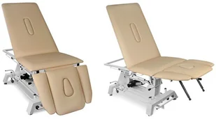 Stół rehabilitacyjny Juventas KSR-FH 3-częściowy z hydrauliczną regulacją wysokości i funkcją fotela Stół rehabilitacyjny Juventas KSR-FH do rehabilitacji lub masażu wyposażony w hydrauliczną regulację wysokości obustronnym przyciskiem nożnym umieszczonym w ramie stołu. Wykonany na stabilnej ramie stalowej lakierowanej proszkowo. Stół rehabilitacyjny posiada 3-częściowe leże z funkcją fotela dzięki regulowanymi pneumatycznie w odpowiednim zakresie sekcjom zagłówka i lędźwiowo-nożną. Zagłówek oraz tylna część leża wyposażone są w otwory z zatyczkami. Wypełnienie leża stanowi elastyczna pianka PU pokryta tapicerką z atestowanego materiału skóropodobnego lub winylowego.