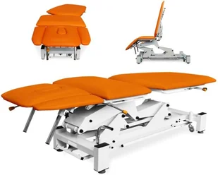 Stół rehabilitacyjny NSR-FTE 3-częściowy do chiropraktyki i trakcji z elektryczną regulacją wysokości oraz pozycją Pivota i funkcją fotela Stół rehabilitacyjny NSR-FTE do chiropraktyki i trakcji oraz rehabilitacji lub masażu i technik manualnych, wyposażony w elektryczną regulację wysokości z ramy wokół podstawy stołu i przewodowym pilotem ręcznym. Wykonany na stabilnej ramie stalowej lakierowanej proszkowo. Stół rehabilitacyjny posiada 3-częściowe leże z funkcją fotela i możliwością regulacji segmentów leża do pozycji Pivota, Trendelenburga i antyTrendelenburga. Specjalna regulacja sekcji lędźwiowo-nożnej na boki umożliwia przeprowadzanie trakcji dolnych partii kręgosłupa. Wypełnienie leża stanowi elastyczna pianka PU pokryta tapicerką z atestowanego materiału skóropodobnego lub winylowego.