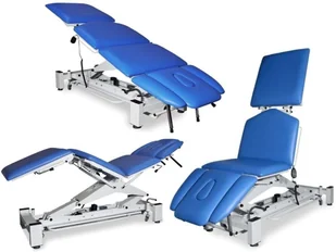 Stół rehabilitacyjny NSR-TE 4-częściowy do chiropraktyki i trakcji z elektryczną regulacją wysokości oraz pozycją Pivota i funkcją fotela Stół rehabilitacyjny NSR-TE do chiropraktyki i trakcji oraz rehabilitacji lub masażu i technik manualnych, wyposażony w elektryczną regulację wysokości z ramy wokół podstawy stołu i przewodowym pilotem ręcznym. Wykonany na stabilnej ramie stalowej lakierowanej proszkowo. Stół rehabilitacyjny posiada 4-częściowe leże z funkcją fotela i możliwością regulacji segmentów leża do pozycji Pivota, Trendelenburga i antyTrendelenburga. Specjalna regulacja sekcji podnóżka na boki umożliwia przeprowadzanie trakcji odcinka lędźwiowego kręgosłupa. Wypełnienie leża stanowi elastyczna pianka PU pokryta tapicerką z atestowanego materiału skóropodobnego lub winylowego.