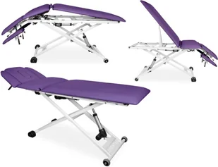 Stół rehabilitacyjny Juventas XSR-3LE 3-częściowy z elektryczną regulacją wysokości oraz pozycji Pivota i funkcji fotela Stół rehabilitacyjny Juventas XSR-3LE do rehabilitacji i masażu lub badania i zabiegów wyposażony w 3 częściowe leże z elektryczną regulacją wysokości oraz elektryczną regulacją leża do pozycji Pivota i funkcji fotela - wszystkie te funkcje sterowane są przewodowym pilotem ręcznym. Stół wykonany jest na lakierowanej proszkowo ramie stalowej o konstrukcji krzyżakowej zapewniającej stabilność podczas zabiegów i masażu. Zagłówek regulowany jest pneumatycznie w zakresie +/- i wyposażony jest w otwór z zatyczką poprawiający komfort pacjenta. Wypełnienie leża stanowi elastyczna pianka PU o grubości 5 cm pokryta tapicerką z atestowanego materiału skóropodobnego lub winylowego. Po obu stronach leża znajdują się relingi do pasów stabilizujących pacjenta.