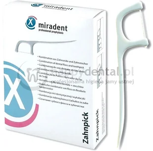 Miradent Zahn-Pick jest jednocześnie wykałaczką, służącą do usuwania resztek pokarmu jak również nicią, która łatwo i bezpiecznie czyści przestrzenie międzyzębowe z osadów.