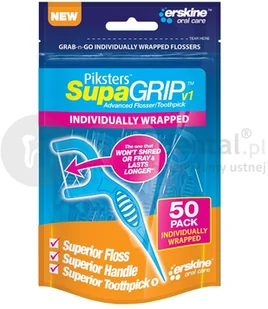 Uchwyt nicio-wykałaczek Piksters SupaGRIP wykonany jest z lekkiego (0,88mgr) i sztywnego polimeru. Uchwyt żebrowanej konstrukcji zwiększa komfort i bezpieczeństwo użycia, gdyż niciowykałaczka nie wyślizguje się z ręki. Produkt dobrze i stabilnie leży w dłoni co polepsza kontrolę podczas wprowadzania nici w przestrzeń międzyzębową. Jedwabiście, gładka taśma PTFE łatwo prześlizguje się przez styczne nie podrażniając brodawek dziąsłowych. Taśma PTFE jest delikatna ale niezwykle mocna dzięki czemu nie zrywa się i nie rozwarstwia w przeciwieństwie do większości nici dentystycznych. Ultracienka, wytrzymała wykałaczka znajdująca się w dolnej części uchwytu uzupełnia codzienną higienę jamy ustnej. Dłuższa i szersza w porównaniu z klasycznymi niciowykałaczkami sekcia "C" pozwala dotarcie w głębsze partie przestrzeni międzyzębowej.