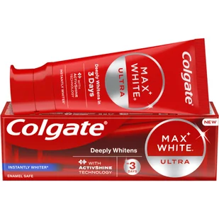 Colgate Max White Ultra Instantly WhiterPostaw na spektakularne rezultaty dzięki natychmiastowemu* i dogłębnemu wybieleniu – i to już w 3 dni! Poznaj Colgate Max White Ultra Instantly Whiter, Twoje najnowsze rozwiązanie w dziedzinie efektywnego wybielania zębów. Wykorzystując najbardziej zaawansowaną technologię Colgate, ta nowoczesna pasta wykracza poza standardowe usuwanie przebarwień powierzchniowych, typowe dla zwykłych produktów. Pasta natychmiastowo wybiela* i precyzyjnie celuje w głęboko osadzone przebarwienia**, pozwalając Ci doświadczyć prawdziwej siły wybielania. Co więcej, innowacyjna technologia ActivShine wygładza powierzchnię szkliwa, dzięki czemu odbija ono więcej światła, zapewniając naturalnie olśniewający efekt końcowy. Dzięki działaniu głęboko utleniającym ta wybielająca pasta do zębów uwalnia wyjątkową, rozgrzewającą i obfitą pianę o poprawionym smaku.