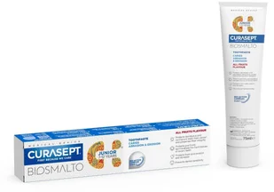 Pasta dla dzieci Curasept BIOSMALTO Junior skutecznie zapobiega próchnicy. Hamuje tworzenie płytki nazębnej. Silnie remineralizuje nowo powstałe zęby mleczne i stałe. Zawiera bioaktywny kompleks, w skład którego wchodzi hydroksyapatyt. Ma owocowy smak.