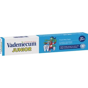 Pasta do zębów Vademecum Junior Spearmint 6+, o smaku świeżej mięty, stworzona z myślą o dzieciach powyżej 6 lat, pomaga chronić zęby przed powstawaniem ubytków oraz szkodliwym działaniem kwasów cukrowych do 12h. Po użyciu wypłukać usta. U dzieci poniżej sześciu lat stosować ilość pasty wielkości ziarnka grochu pod kontrolą dorosłych, aby zminimalizować ryzyko połknięcia. Przy przyjmowaniu fluoru z innych źródeł należy skonsultować się ze stomatologiem lub lekarzem. Zawiera Fluorek Sodu (1450 ppm F$62). Ilość fluorku zalecana przez dentystów. 12 h Tarcza przed kwasami cukrowymi aby chronić przed powstawaniem ubytków.