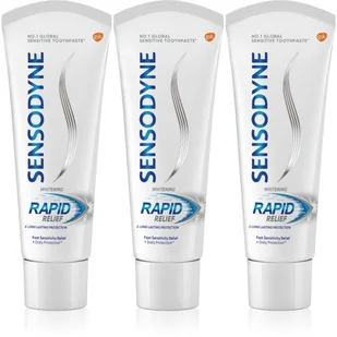 Sensodyne Rapid Whitening, 3x75 ml, Pasty wybielające unisex, Pasta do wrażliwych zębów Sensodyne Rapid Whitening gwarantuje, że będziesz się delektować zimnymi lub gorącymi napojami bez nieprzyjemnych odczuć. Pożegnaj się z nadwrażliwością zębów. Właściwości: walczy z próchnicą zębów i osadem nazębnym wybiela zęby zmniejsza wrażliwość zębów Sposób użycia: Stosuj co najmniej 2× dziennie.