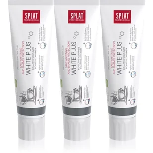 Splat Professional White Plus, 3x100 ml, do wzmocnienia szkliwa unisex, Pasta do zębów Splat Professional White Plus jest przeznaczona do delikatnego wybielania zębów. Skutecznie usuwa niepożądane przebarwienia z zębów, a przy regularnym stosowaniu wynagradza bardziej promiennym uśmiechem. Właściwości: wybiela zęby gwarantuje delikatną pielęgnację szkliwa zębów usuwa kamień i osad nazębny zmniejsza wrażliwość zębów Sposób użycia: Stosuj co najmniej 2× dziennie.