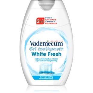 Vademecum 2 in1 White Fresh, 75 ml, Pasta i płyn do płukania 2w1 dla kobiet, Pasta do zębów i płyn do płukania ust „2 w 1” Vademecum 2 in1 White Fresh łączy w sobie jakość pasty do zębów i świeżość płynu do płukania jamy ustnej. Dzięki temu zapewnia perfekcyjną i łatwą pielęgnację zębów. Właściwości: usuwa osad nazębny odświeża oddech chroni zęby przed próchnicą łagodzi problemy dziąseł działa wybielająco Skład: mentol Sposób użycia: