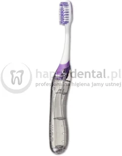 GUM Ortho Travel turystyczna szczoteczka ortodontyczna posiada średniej twardości, wytrzymałe włókna ukształtowane w literę V, które umożliwiają delikatnie czyszczenie zębów wokół elementów aparatu ortodontycznego (klamry, zamki, łuki). Ukształtowanie włosia w literę V pozwala na dokładne i bezpieczne czyszczenie zarówno zębów jak i elementów aparatu ortodontycznego, bez użycia nadmiernej siły i deformacji włókien szczoteczki. Wygodna, składana rączka posiada otwory, które zapewniają odpowiednią wentylację i swobodne wysychanie włókien szczoteczki.