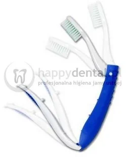 Szczoteczka dzięki niewielkim rozmiarom po złożeniu idealnie nadaje się w podróż jak również do pracy. Posiada opatentowane antybakteryjne włosie DomeTrim(R). Wentylowana nasadka służy jako uchwyt oraz jako "schowek" dla szczoteczki.