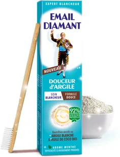 Email Diamant Doucer d'Argile - "pasta inspirowana naturą" która połączyła tradycyjne składniki białej glinki i organicznego oleju kokosowego z naturalnymi składnikami, które dbają o szkliwo zapewniając efekt widocznie bielszych zębów. Pasta składa się z 92% naturalnych składników, które wspomagają wybielanie przy jednoczesnej ochronie szkliwa dzięki niskiej ścieralności. Ze względu na zawartość oleju kokosowego pasta posiada właściwości antybakteryjne i przeciwgrzybicze. Zawarty w paście wodorowęglan sodu pomaga w usuwaniu powierzchniowych przebarwień, nawet tych w najtrudniej dostępnych miejscach oraz wykazuje działanie ochronne przed skutkami oddziaływania kwasów. Formuła pasty została wzbogacona również o witaminę E która znana jest ze swoich właściwości regenerujących i kojących. Wpływa pozytywnie na dziąsła, minimalizując powstawanie stanów zapalnych, hamując krwawienie i przyspieszając gojenie uszkodzonej błony śluzowej w jamie ustnej. Dzięki zawartości olejku miętowego, pasta zapewnia na długi czas świeżość w jamie ustnej. Pasta Email Diamant Doucer d'Argile zawiera fluor (1100 ppm), dzięki czemu zapewnia ochronę przeciw próchnicy oraz wspomaga remineralizację szkliwa. Sposób użycia: Pasta Email Diamant Doucer d'Argile przeznaczona jest do codziennego użytkowania. Pierwsze efekty delikatnie wybielonych zębów, możemy zauważyć już po piątym dniu stosowania. Należy wycisnąć ok. 1cm pasty, myć zęby i masować delikatnie dziąsła przez kilka minut. Następnie kilkukrotnie przepłukać usta. Pasty nie należy połykać. Do stosowania powyżej 7 roku życia.